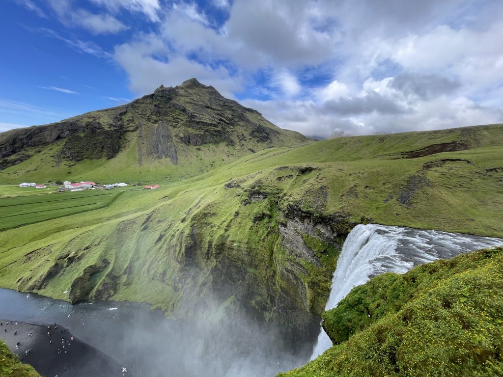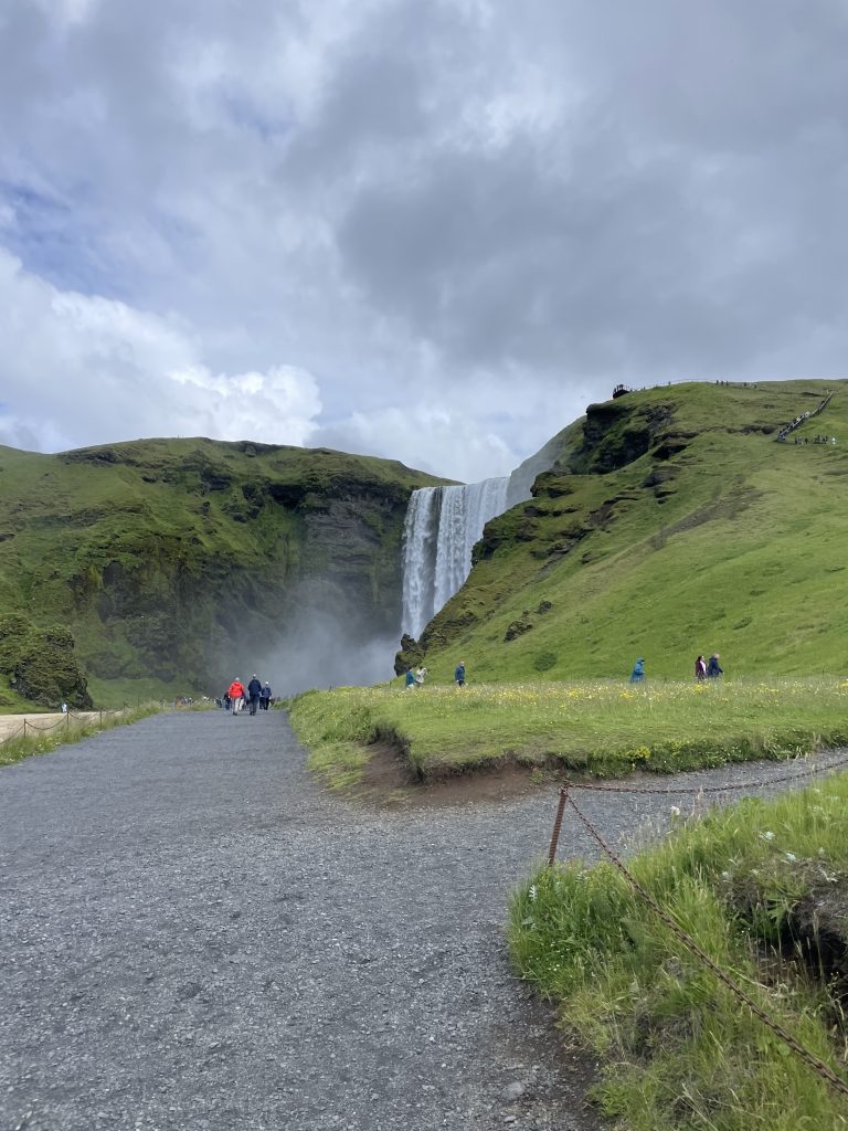 Next we headed to Skogafoss. This is one of the most well known and photographed waterfalls in Iceland. You have likely seen it if you googled “things to see in Iceland”. The waterfall stands at 60 meters or 197 feet tall! There is a large parking lot, though it was getting full by the time we arrived, which was around noon, and many tour buses had shown up. And as you walk to the waterfall you will notice a large set of stairs. Take the stairs up and you will get a really incredible view of the top of the waterfall and of the sea.