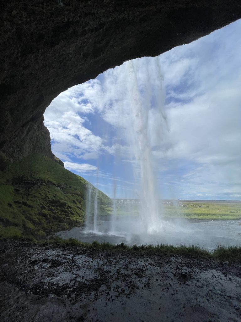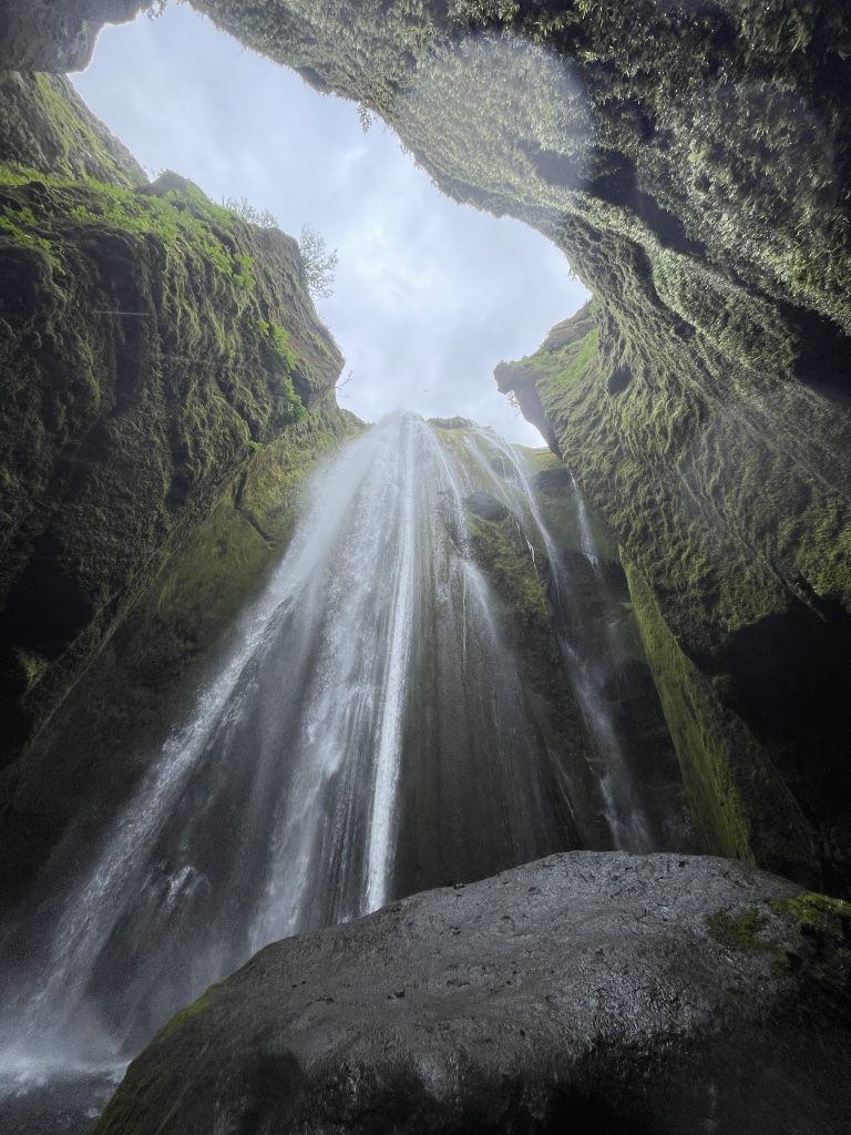 So how do you get to the not so secret “secret” waterfall? The secret waterfall is called Gljúfrabúi, located around the corner from Seljalandsfoss. There is the main path that you stand on when looking directly at Seljalandsfoss. Turn to the left and follow the path towards Gljúfrabúi. You will need to walk through water to get to the famous rock people stand on. While I don’t advise standing on the rock, people did, though it is very slippery so be very careful.
